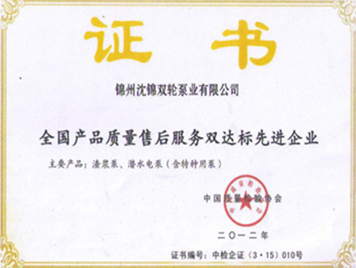 全國產(chǎn)品質(zhì)量售后服務(wù)雙達(dá)標(biāo)先進(jìn)企業(yè)